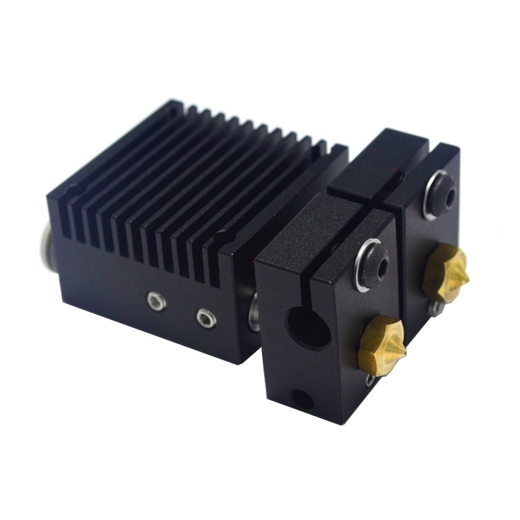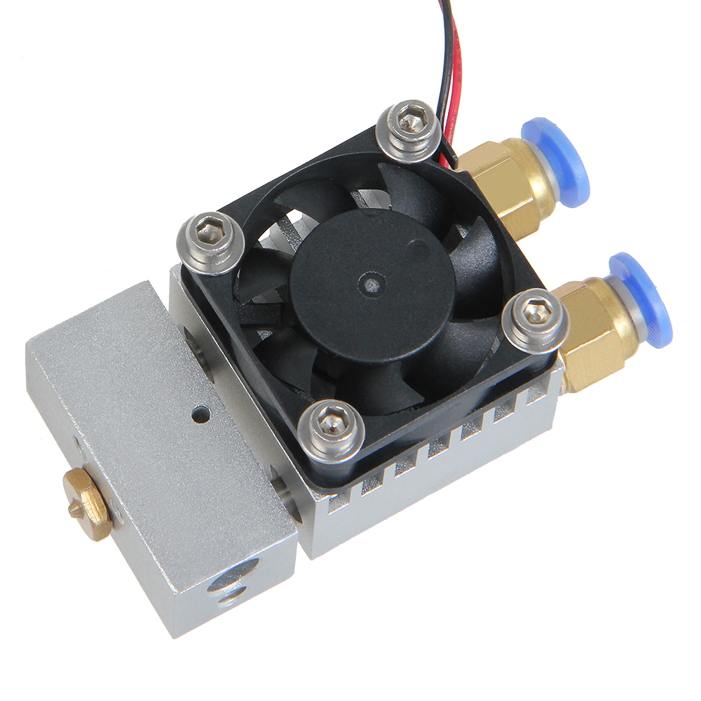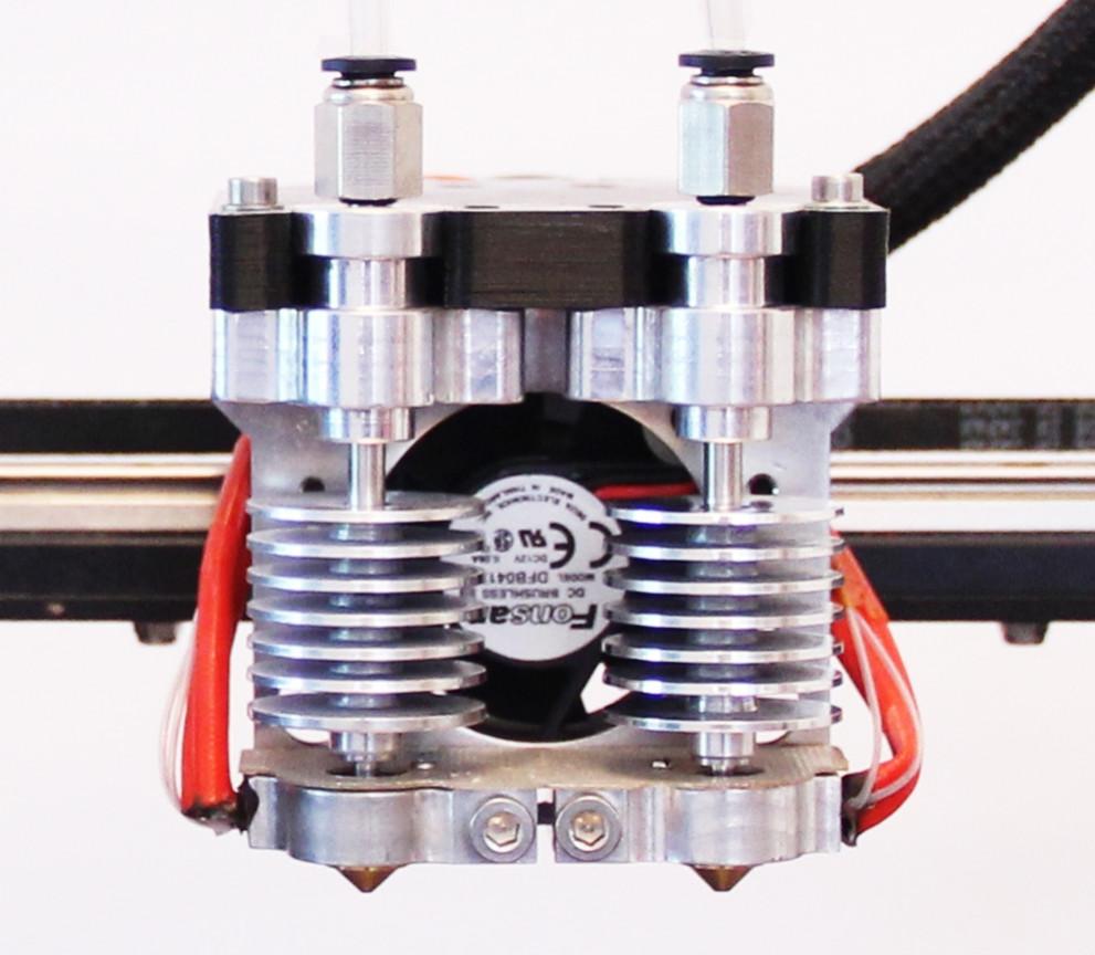 В этом хотэнде есть два параллельных канала для пластиковой нити, которые проходят через общий радиатор. Каждый канал заканчивается своим отдельным нагревательным блоком. Таким образом, можно использовать два разных филамента с разными температурами плавления при печати одного объекта. Такая возможность значительно повышает функционал принтера. Например, это позволяет печатать поддержки для сложных моделей отдельного материала. Если правильно подобрать материал на роль поддержек, то это значительно упростит их удаление после печати, облегчая базовую постобработку напечатанной модели.
